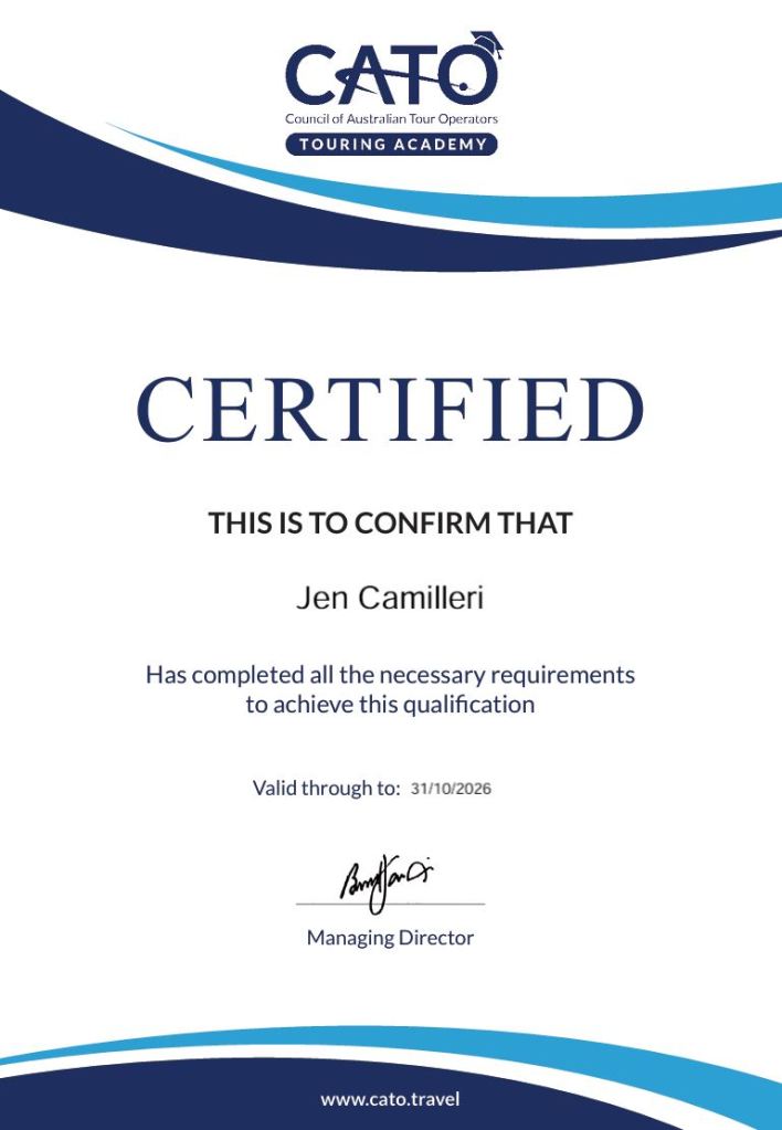 Becoming CATO certified isn’t just a title, it’s a commitment to excellence, ethics, and expertise in the travel industry. CATO (Council of Australian Tour Operators) sets some of the highest standards in the industry for safety, professionalism, and product knowledge. Being certified means I’m recognised as a specialist who understands what makes a tour operator truly trustworthy, well-run, and traveller-focused.