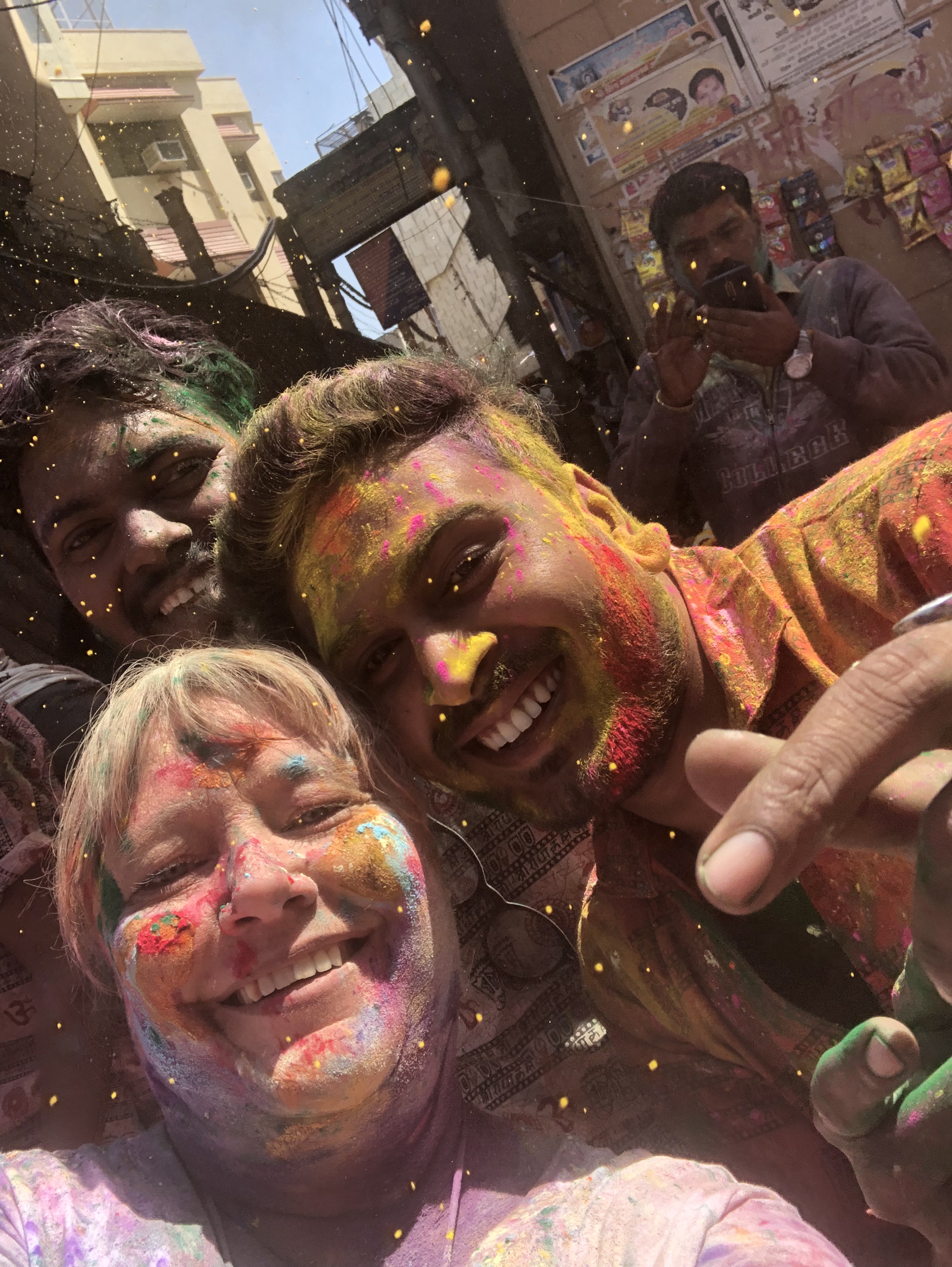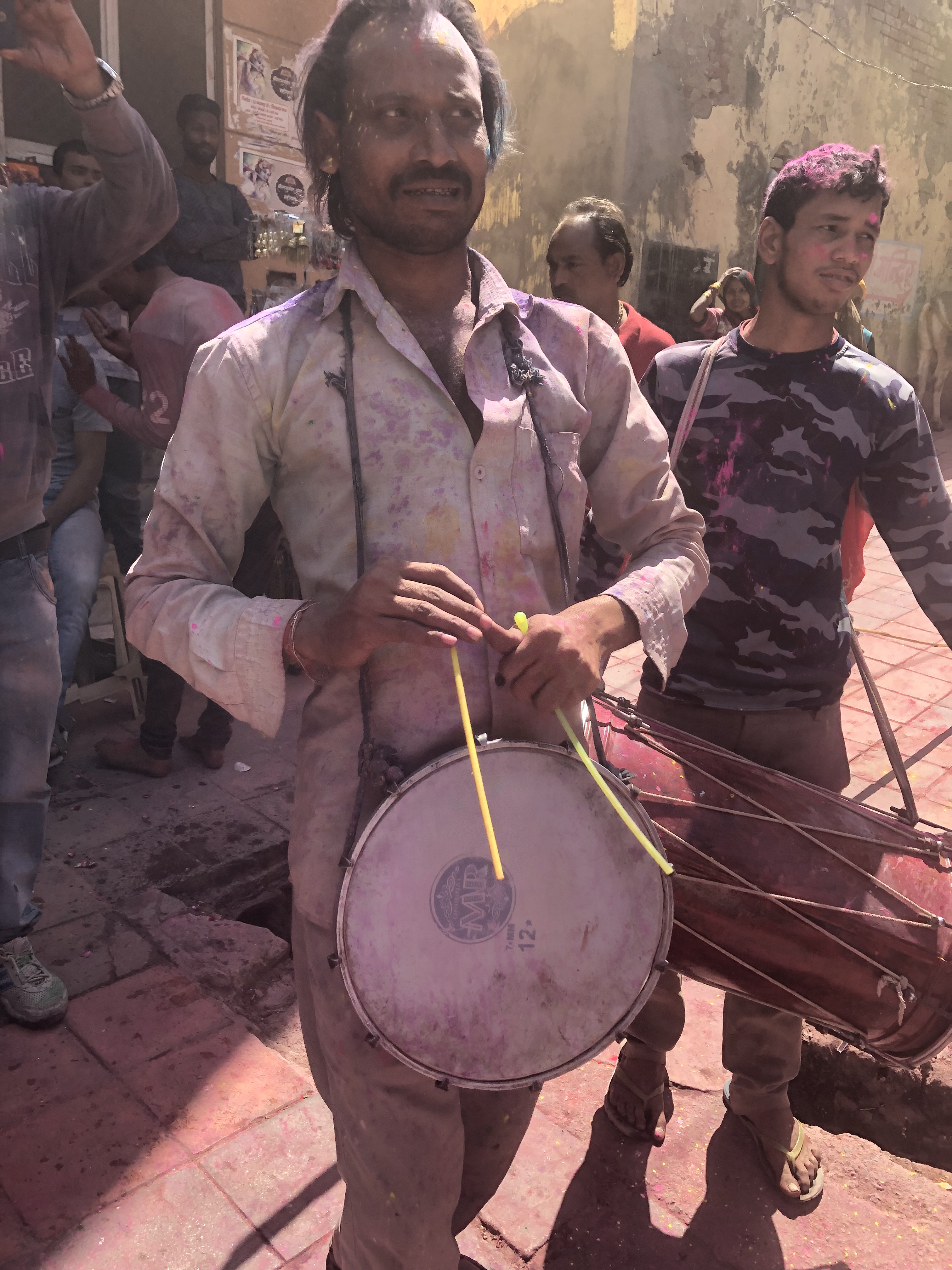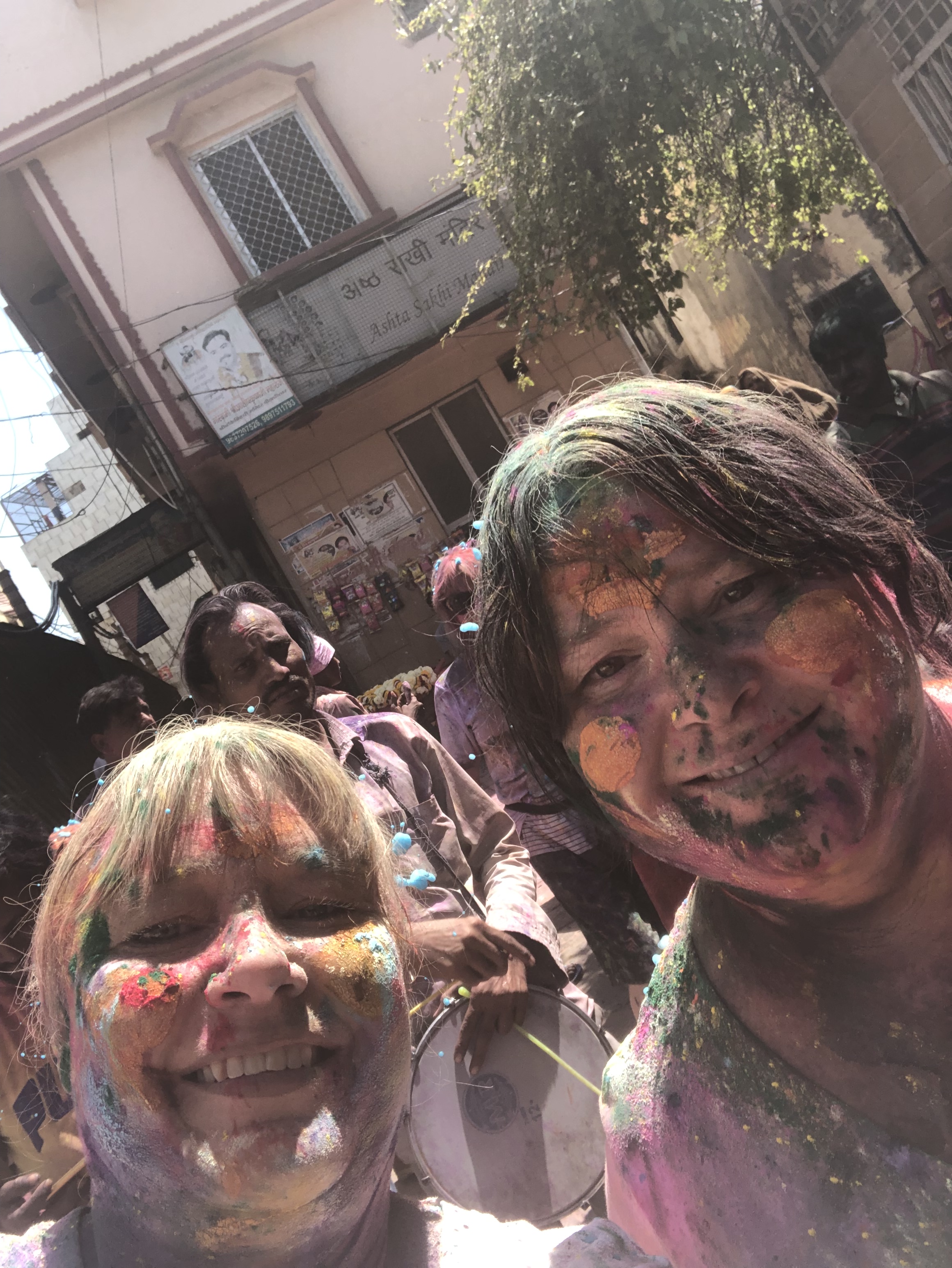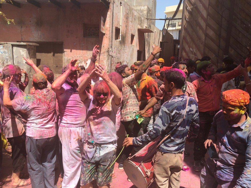 The moment we stepped out of the tuk tuk, we were immersed. Colour was everywhere, thrown, smeared, scattered through the air, and strangers greeted us instantly with the words “Happy Holi,” laughing as they reached out to paint our faces. Drums beat in every direction, people danced in the streets, and the entire town moved as one living celebration of joy.