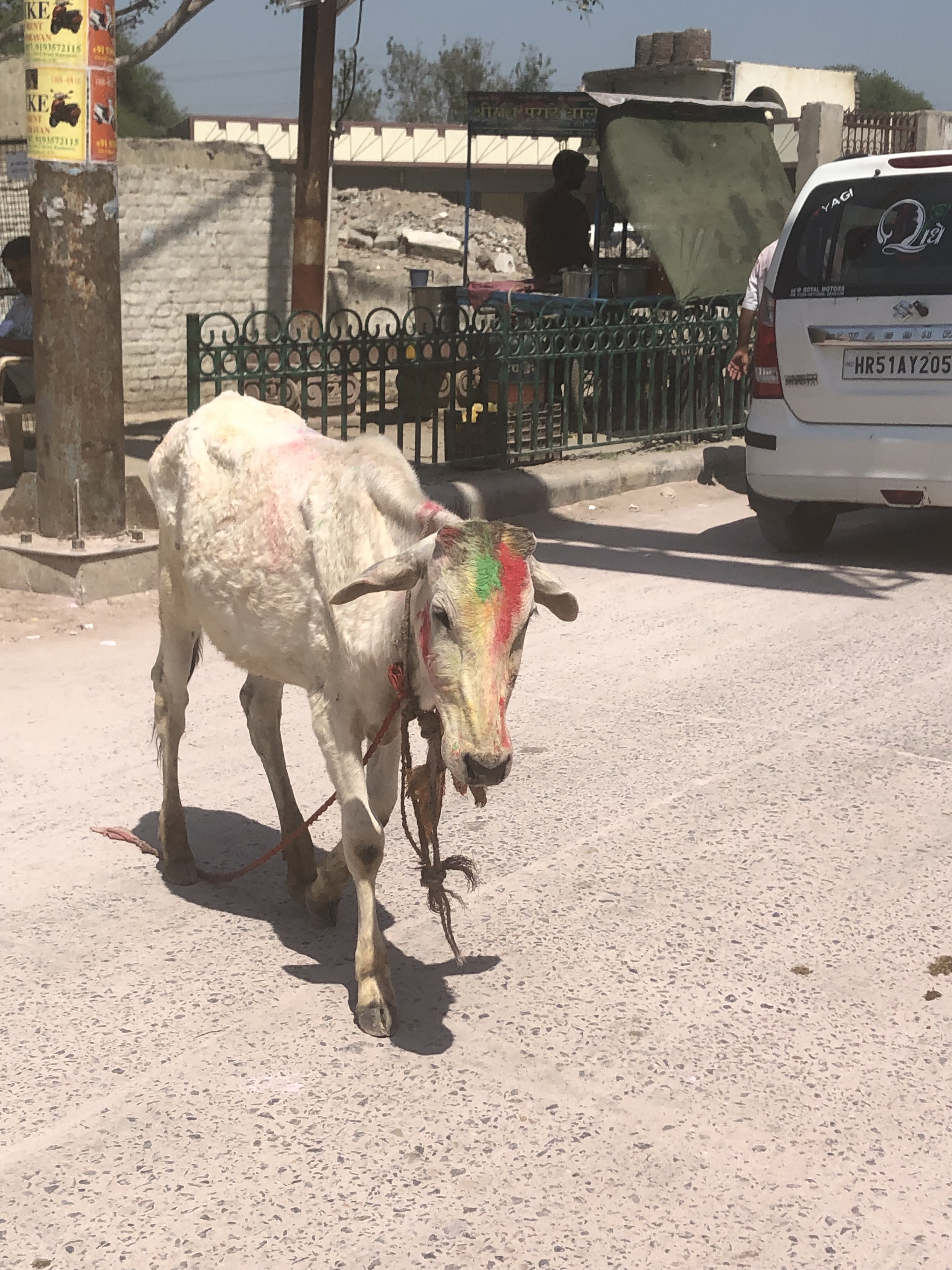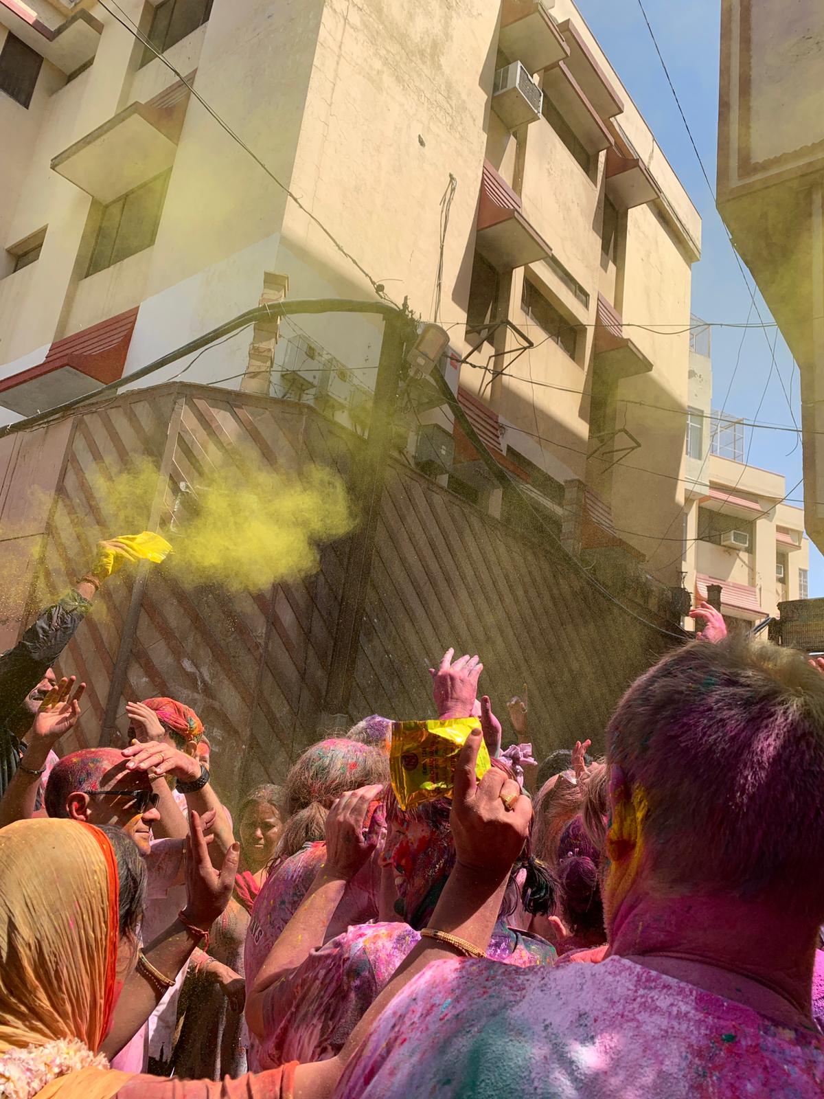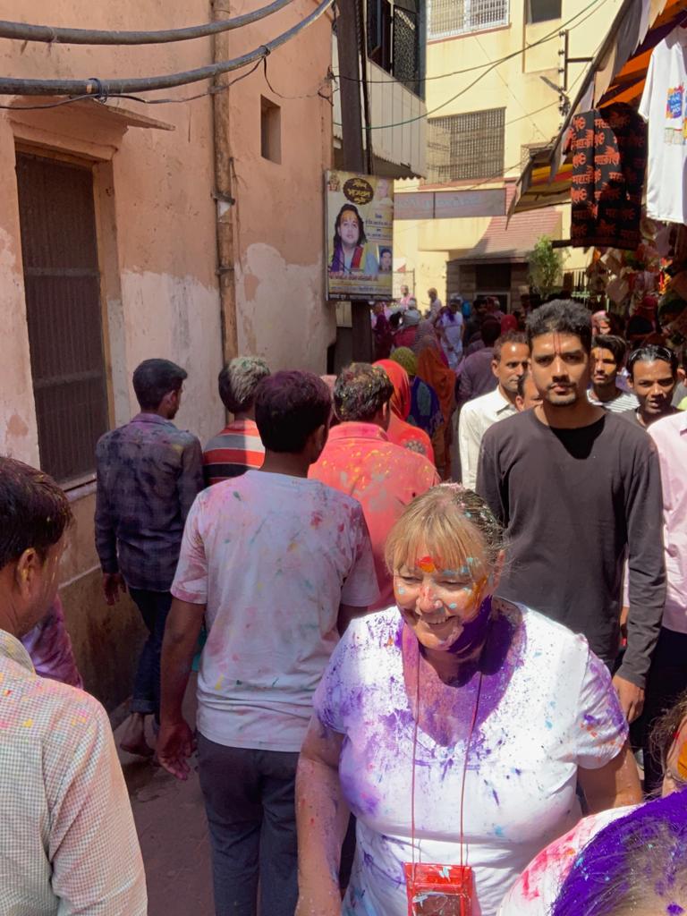On the way, we passed a cow wandering freely through the streets, its head already splashed with bright pigments, an early hint of the celebration that was unfolding everywhere. While many visitors choose to experience Holi from within the safety of hotel courtyards or organised events, we wanted something different. With trusted guides, we chose to step fully into the heart of it, to experience it as authentically as possible.