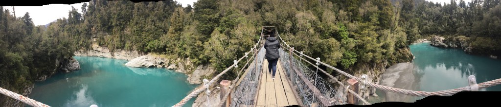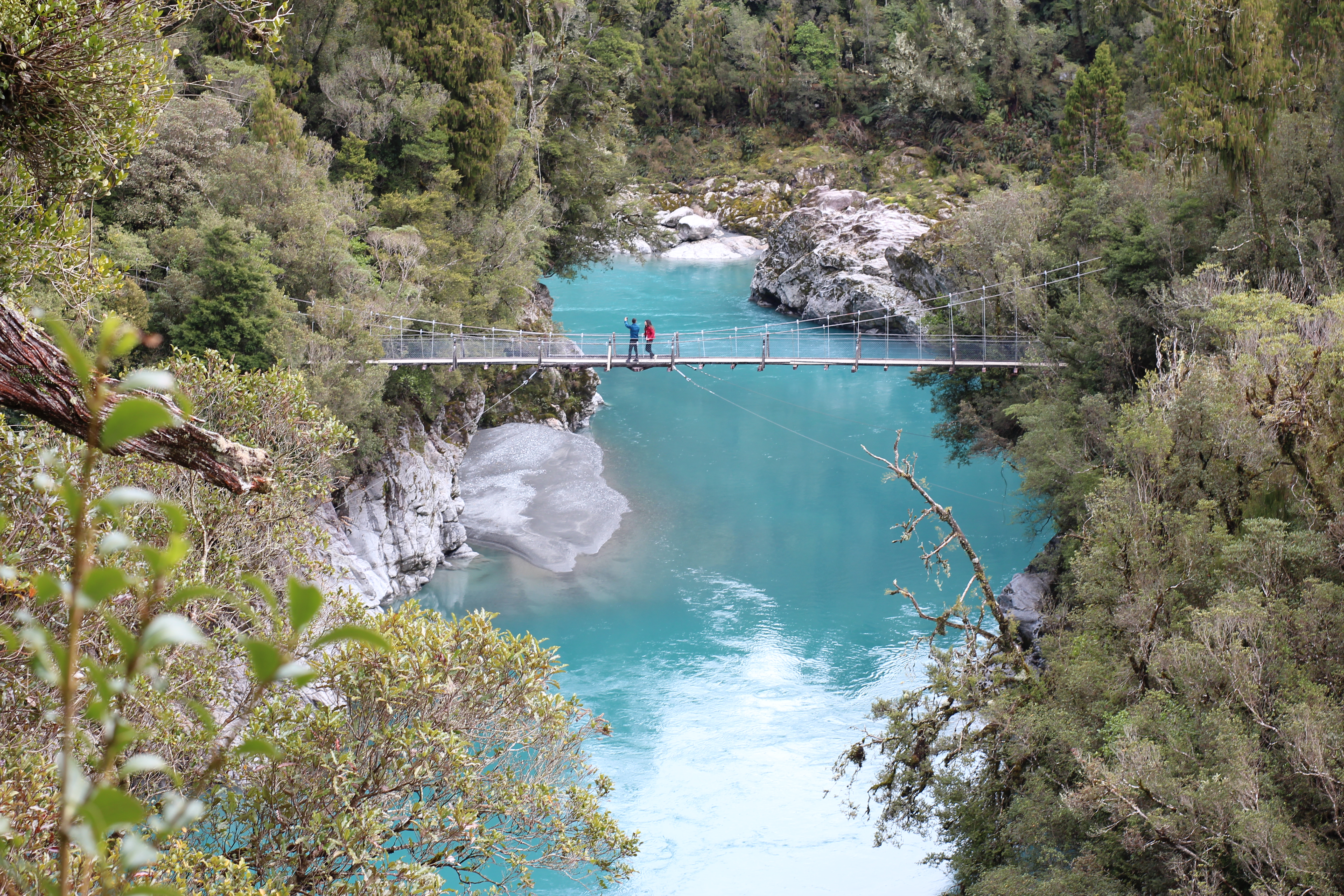 To really take in the landscape, we crossed one of the area’s long suspension bridges, gently swaying above the rushing river below. From the middle of the bridge, the view stretched in both directions: the bright turquoise water weaving through wide rocky riverbeds, dense West Coast forest lining the banks, and steep mountains rising in the distance.
